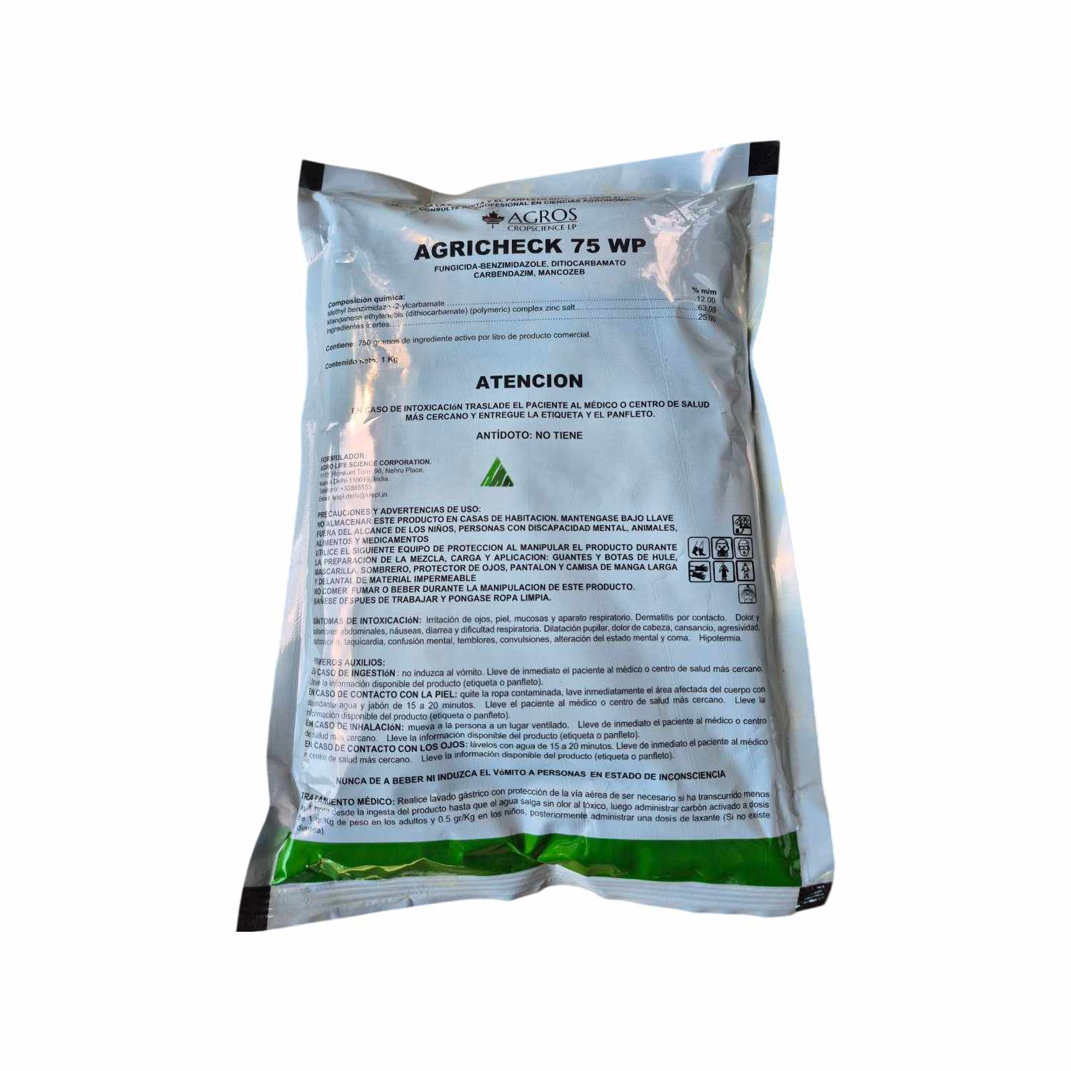 AGRICHECK 75 WP es un fungicida formulado con la combinación de Carbendazim (12%), un benzimidazol de acción sistémica, y Mancozeb (63%), un ditiocarbamato con acción de contacto y efecto protector.